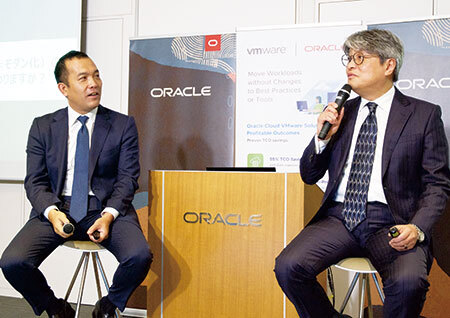 日本オラクルの本多充常務執行役員(左)とデジタル庁の西村毅クラウドアーキテクト