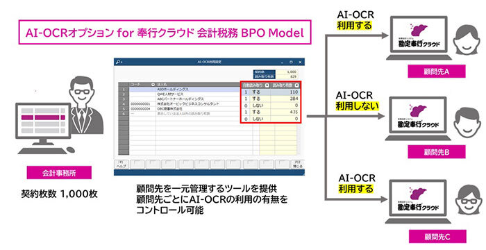OBCでは、税理士・会計事務所が「勘定奉行クラウド」を利用している顧問先を一元管理し、複数の職員で顧問先のデータを処理・管理することができる「奉行クラウド 会計税務 BPO Model」を提供している。今回、同製品のオプションとして、顧問先から収集した証憑をAI-OCRで読み取り、仕訳起票を自動化するAI-OCRオプションを発売した。