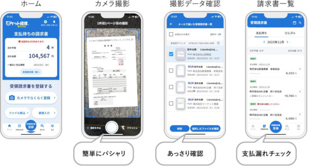 ポケット経理 請求支払は、あらゆる請求書を改正電子帳簿保存法(電帳法)に準拠した電子データとして一括保存が可能なスマホアプリ。紙の請求書は同アプリ上から撮影することで電子データ化して一括保存することができる。また、請求内容はAI-OCRによりインボイス制度に対応した適格請求書かどうかを自動的に判定し、アプリ上で支払予定金額を合計表示できる。