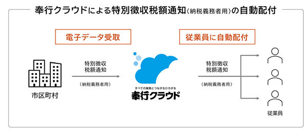 24年度からは、給与支払報告書を電子申告することで、従業員に配付する「特別徴収税額通知」を電子データで受け取ることができる。しかし、市区町村から届いた電子データを従業員ごとに分割し、各従業員に配付するという作業は必要になる。OBCでは、今回の改正にともない、電子データの「特別徴収税額通知」を従業員に自動配付できる体制を奉行クラウドで提供する。