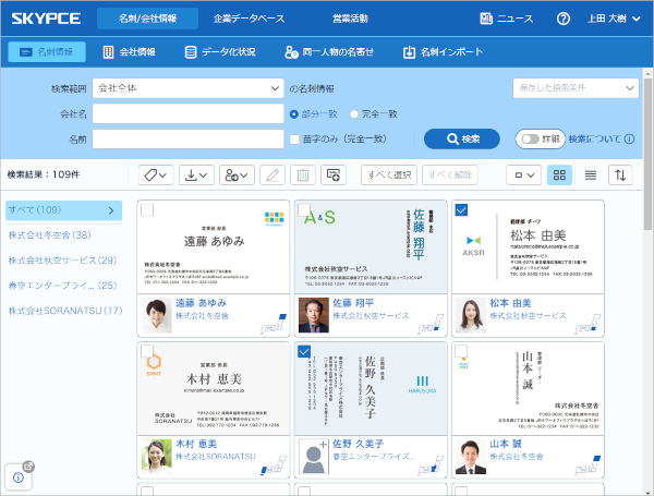 「SKYPCE」は、業務で得た名刺を安全に管理し、活用するためのサービス。会社・組織全体で集約した名刺情報をSKYPCE上で管理し、営業活動などに活用することができる。また、顧客からの希望があればいつでも、高解像度の名刺画像を含めたすべての名刺データを返却するサービスも提供している。