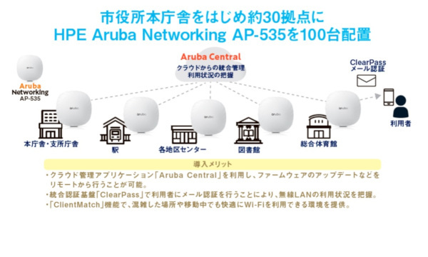 新システムでは、高性能無線アクセスポイント「HPE Aruba Networking AP-535」(Aruba AP)合計100台を約30拠点に配置し、本庁舎には無線LANコントローラー「HPE Aruba Networking 7000シリーズ・モビリティ・コントローラー」を設置している。HPE Aruba Networking独自の統合認証基盤「ClearPass」によるメール認証でユーザーや端末を識別することで、利用状況の把握が可能になった。利用者はメールアドレス登録後に送付される設定メールのリンクをクリックするだけで、手間なくフリーWi-Fiサービスを使えるようになる。
