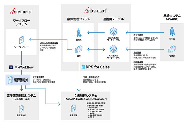 特に営業にまつわる事務作業で、その膨大な取引先と取扱品目があるなかで紙を用いた各種情報や帳票の作成・管理による業務負荷が大きな課題となっていた。そこで、ワークフローシステムの基盤としてすでに運用しているイントラマートのクラウド型アプリケーションプラットフォーム「Accel-Mart Plus」とスムーズに連携でき、営業部門に閉じた部分最適ではなく、後続の業務で利用する基幹システムなどとの柔軟な連携が可能なDPS for Salesを採用した。
