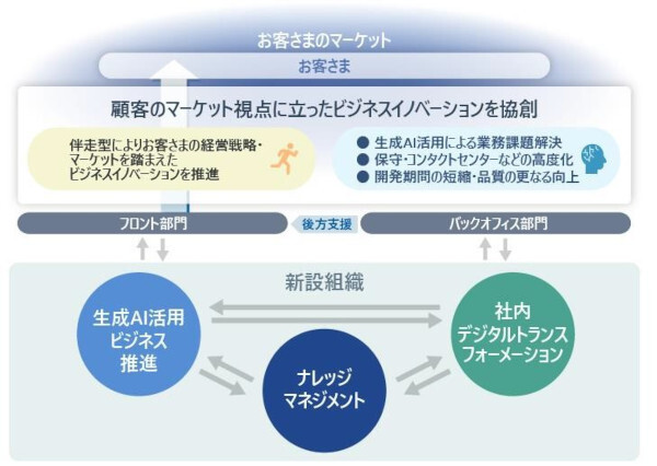 この取り組みは、4月に新設した「ビジネスイノベーション統括本部」が中心となり推進していく。同本部では、「生成AI活用ビジネス推進」「社内デジタルトランスフォーメーション」「ナレッジマネジメント」の3機能に加え、フロント部門やバックオフィス部門と連携することで、マーケット視点に立ったビジネスイノベーションを協創していく。