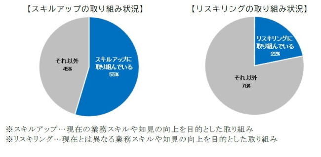 スキルアップ・リスキリングの取り組み状況をみると、全体ではスキルアップに取り組む人は5割を超えるが、リスキリングに取り組む人は約2割と、業務に関連したスキルの向上に取り組む人が多い傾向が明らかになった。