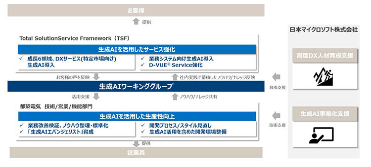 こうした取り組みを行う中で、今後は生成AIのさらなる発展に向けて、同技術を深く理解し先端を走るチームが必要と考え、ワーキンググループを立ち上げた。生成AI-WGでは、同社サービス体系である「Total SolutionService Framework」の各種サービスに「Azure OpenAI Service」を組み込み、生成AIを活用した生産性向上を目指した取り組みを進める。
