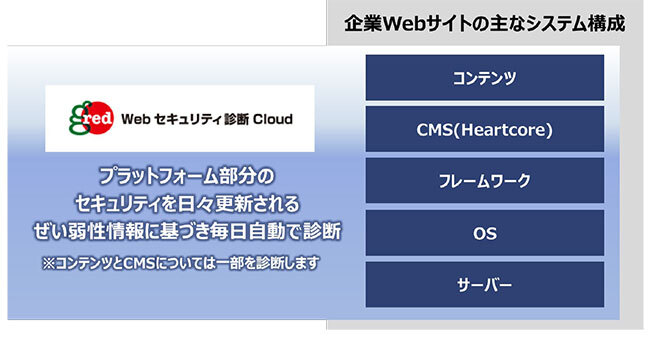 GRED Webセキュリティ診断 CloudをHeartCore CMSと組み合わせて利用することで、ウェブサイトのプラットフォームに対して、常時アップデートされるぜい弱性情報をもとに診断を行うことが可能となる。