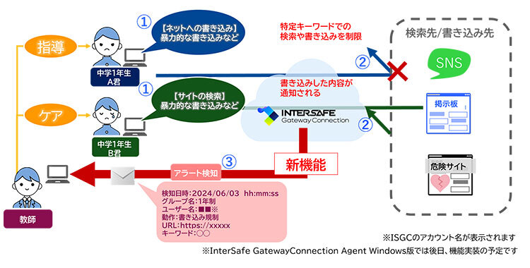 今回新たに追加したアラートメール機能は、事前に登録したキーワードによるインターネット上での書き込み(SNSや掲示板など)や検索、不適切なウェブサイトへのアクセスを検知した際に、管理者にアラートをメールで通知する機能。キーワードは、管理画面から自由に指定することができる。アラートメールでは、「検知日時」「グループ名」「ユーザー名」「カテゴリー」「動作」「URL」「キーワード」が通知されることから、該当者の特定が容易で、ネットいじめやの薬物利用などリスクの防止対策に役立つ。