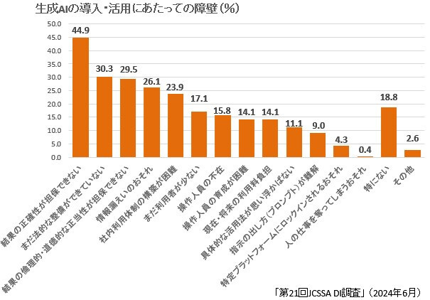 生成AIの導入・活用にあたっての障壁については、「結果の正確性が担保できない」が突出して高く44.9%。次いで「まだ法的な整備ができていない」(30.3%)、「結果の倫理的・道徳的な正当性が担保できない」(29.5%)が3割前後で続いた。これら上位3項目は、いずれも前回比で比率が拡大。問題点が徐々に明確化してきた。また「現在・将来の利用料負担」が14.1%。比率はそれほど高くないものの、前回比では6.8ポイント増と、ほぼ倍増。生成AIが活用フェーズに入ったことで、現実的なコスト面での課題意識が高まっている点も明らかになった。