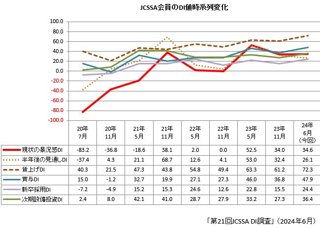 DIについては、8項目中6項目が前回を上回った。前回比でプラス幅が最も大きかったのが「賃上げDI」と「賞与DI」。一方、マイナス幅が最も大きかったのは「半年後の景況感見通しDI」だった。「現状の景況感判断DI」は34.6と前回から0.6ポイント増。「半年前との景況感比較DI」は28.3で前回比0.4ポイント減と、いずれもほぼ横ばいだった。一方「半年後の景況感見通しDI」は26.1の6.3ポイント減。しかし、マイナス幅は1桁にとどまった。