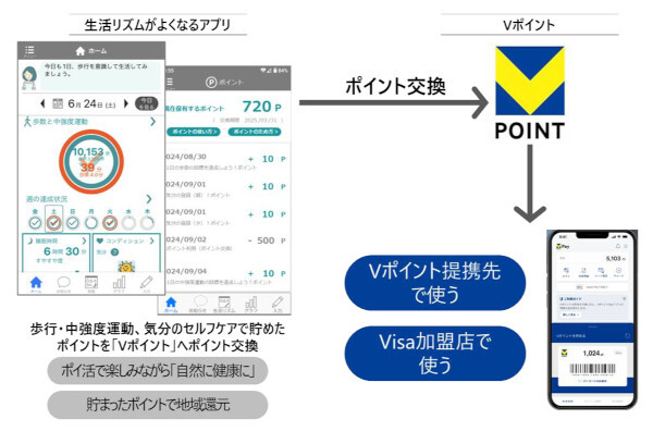 生活リズムがよくなるアプリは、日立システムズが2022年2月からサービスを提供している企業の健康経営を支援する「健康支援サービス(健康経営)」で、従業員一人ひとりの体と心のセルフケアをサポート。歩行や中強度運動をすることや、気分のセルフケアを登録することでポイントを貯める機能を備えている。今回、貯めたポイントは、10ポイントを1ポイントのレートでVポイントに交換できるようになる。交換したVポイントは、日本全国のVポイント提携先や世界中のVisa加盟店での利用が可能となる。