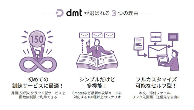 dmtは、自社で運用可能な完全セルフ型の標的型攻撃メール訓練サービス。煩わしいサービス提供者とのやり取りは一切不要で、月額150円(税別/1メールアドレス)でフル機能を利用でき、回数無制限で何度でも繰り返し訓練を行うことができる。最新の攻撃メールを参考に180種類以上の訓練シナリオをあらかじめ用意している。