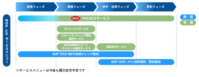 主な提供メニューは、「PoC支援サービス」がヒアリングシート提供、検証項目提供、PoC環境構築支援、検証支援など。「導入支援サービス」がヒアリングミーティング参加、ドキュメント作成支援、構築時問い合わせ対応、検証・構築・試験時の立ち合いなど。「最適化サービス」が保守対応、定期レポート提供、利活用促進など。「更新提案支援サービス」が市場別トレンド勉強会、事例紹介、新機能勉強会、導入前事前検証サポート、契約期限管理など。