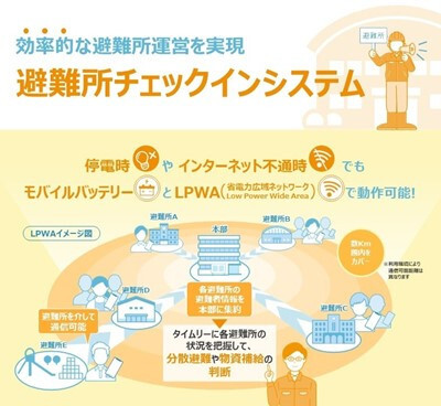 避難所チェックインシステムは、災害時に避難所へのチェックインをスマートフォンで行えるようにするシステム。避難所を運営する職員の事務負担を軽減し、防災データの共有、活用を促進する。