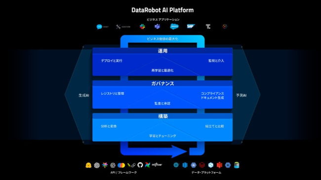DataRobot AI Platformは、予測AIと生成AIの開発・管理・監視を一元化することで、さまざまなAIモデルの構築やデータ分析などのプロセスを簡略化する。生成AIの開発・運用には多様な技術を組み合わせる必要があるが、すべての機能を単一プラットフォーム上で網羅するため開発効率を大幅に向上できる。プログラミングスキルが少ないユーザーでも使いやすいインターフェースを提供するため、データサイエンティストからビジネスユーザーまで幅広い層が利用可能で、チーム全体でAIプロジェクトを成功に導くことができる。