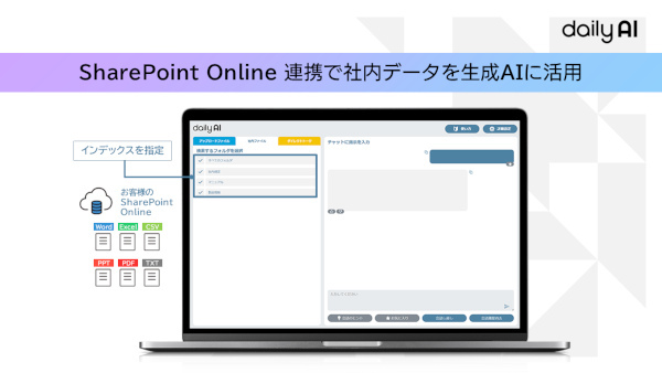 具体的には、顧客環境のSharePoint Onlineに、dailyAI専用のデータ格納場所を用意することで、社内データを利用した生成AIとの対話が可能となる。顧客環境のSharePoint Onlineと連携するため、すでにSharePoint Onlineを利用している顧客にとってはデータを二重管理する手間がなく、簡単に導入できる。格納するデータは、最大10個までインデックス(分類)が可能で、検索対象となるインデックスを指定することで、より精度の高い検索結果を導き出す。対応するデータは、Word、PPT、Excel、CSV、TXT、PDFとなる。