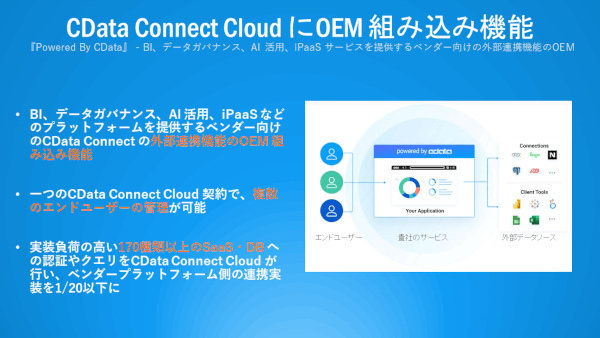 今回リリースしたPowered By CData機能は、CData Connectの外部データ連携機能のOEM組み込みを可能にするもの。サービスベンダーは、CData ConnectをOEM組み込みすることにより、数年の開発期間が必要な外部データ連携機能を素早く実装できる。また、170以上のSaaS・DBへの接続機能を自社開発と比べて20分の1以下のコストで実装し、エンドユーザーが望むデータ連携を提供することが可能となる。