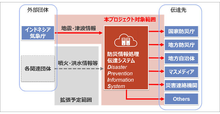 DPISは、国内で災害発生時に自治体などで運用されている災害情報共有システム「Lアラート」のノウハウをベースに、インドネシア共和国(インドネシア)で政府が災害情報を迅速に発信し、国民の安全・安心を守るためのシステム。