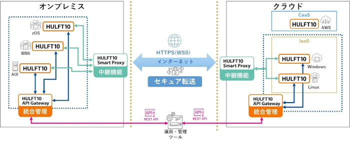セキュリティーの強化では、FIPS140-2を取得した「HULFT10 Cipher Option(AES)」で転送データを暗号化し、安全にファイルを転送することができる。また、転送データを復元不可能な状態で削除する機能を実装し、システムのデータセキュリティー基準「PCI DSS v4」準拠を支援。クレジットカード情報と取引情報を保護する。このほか、オンプレミスやクラウド間をインターネット経由でセキュアにデータ中継する「HULFT10 Smart Proxy」を提供する。