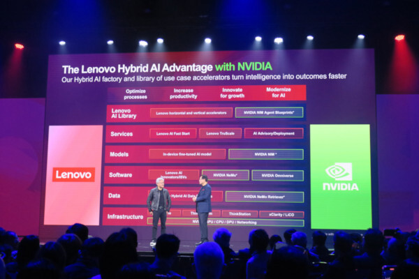 レノボは2023年の年次イベントで、エヌビディアとの戦略的パートナーシップの強化を発表したが、今年はさらに協業を拡大し、インフラ、データ、ソフトウェア、基盤モデルなど、AIに関わるすべてのフェーズでエヌビディアと連携すると表明した。15日の基調講演では両社のトップがそろって登場。AIによるコンピューティングをあらゆる場所で高速かつ簡便に提供するフレームワークとして「Lenovo Hybrid AI Advantage」を発表した。