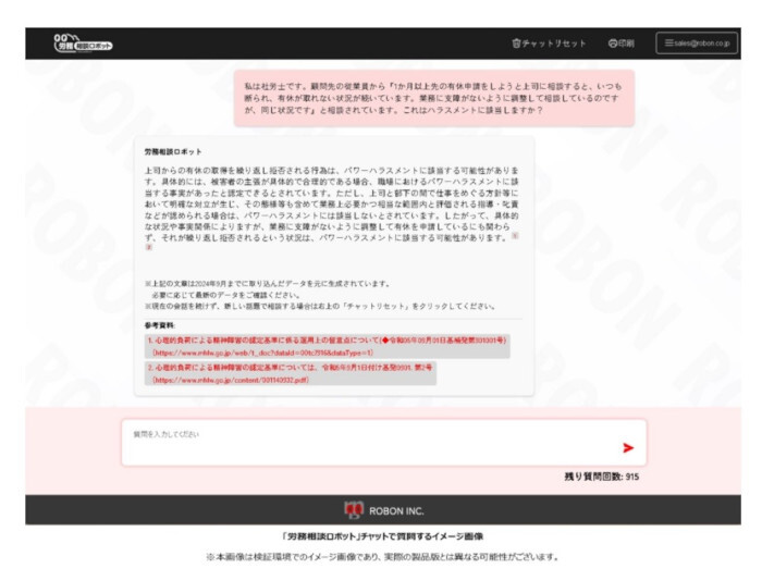 労務相談ロボットは、こうした課題解決に必要な最新の法令、通達、判例、Q&Aなどあらゆる労務領域に特化したオフィシャルデータを学習させている。生成AIのチャットに質問するだけで、文章の形で出典元とともに回答を得ることができる。質問できる対象項目は労働基準法、労働契約法、労働組合法、労働関係調整法、労働安全衛生法、職業安定法、最低賃金法、障害者基本法など広範囲に網羅している。