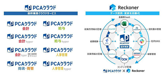 PCAクラウドは、インターネットを通じて簡単かつ低コストで利用できる基幹業務ソフト。会計・販売管理・人事給与をはじめ、税務など幅広い業務をサポートしている。一方、Reckonerは、データの集約・加工・連携をノーコードで誰でも簡単に実行できるクラウドサービス。コーディングを行うことなく、ブロックをつなげるような簡単3ステップのマウス操作で、すばやくラクにデータを連携できる。