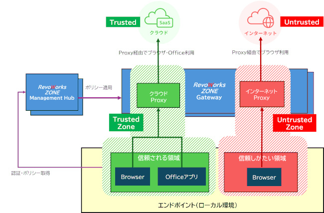 RevoWorks ZONEは24年5月、デジタル庁による「三層分離の廃止」と「ゼロトラストアーキテクチャへの移行」の方針発表を受け、セキュアゾーン機能を中心としたアーキテクチャーとすることにより、三層分離型のセキュリティー対策からゼロトラストアーキテクチャーへ対応するガイドラインに準じた開発を進めている。同社独自のサンドボックス技術を応用し、クラウドアクセスとインターネットアクセスを端末内のサンドボックスとゲートウェイが協調するセキュアなゾーンを形成させ、サンドボックスを構成するセキュリティーエンジンが、許可されたプログラム以外の実行を制御することでマルウェアなどの実行を防御する。