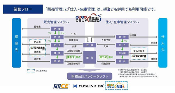 また、MJSが提供する財務・会計システムや、デジタルインボイスの送受信や適格請求書(インボイス)の電子化に対応するクラウドサービス「Edge Tracker 電子請求書」とも連携し、販売管理と仕入・在庫管理にかかる業務をトータルでサポートする。