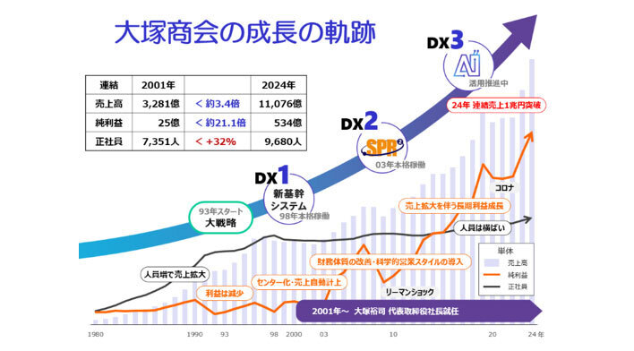 大塚商会では、90年代から大戦略(大塚経営戦略)と呼ぶITを活用した経営革新の取り組みを進め、取引に関わる一連のデータの一気通貫を実現し、あわせて、各組織のセンター化を行うことでビジネスプロセスを刷新することでデータドリブンな企業経営への変革につなげた。2000年代には、同社独自開発のCRM(顧客管理)+SFA(営業支援)のシステム「SPR」を稼働し、科学的営業スタイルを実現、営業プロセスの変革で生産性を大幅に向上した。