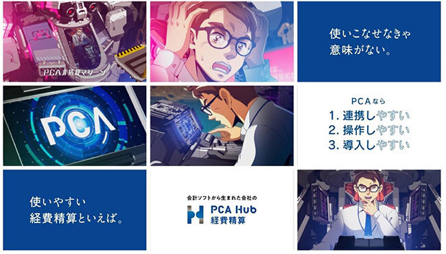 CM制作にあたっては、世の中にあふれる経費精算システムとの差別化ポイントとして、経理部門もそれ以外の社員が「使いやすい経費精算システム」を企画の核として考えたという。PCA Hub 経費精算の特徴を幅広い世代に伝えるため、現役世代が夢中でTVアニメを見ていた時代を思いおこさせるような、少し太めの線と、やわらかい色味のアニメーションが、なつかしい時代を感じさせる演出となっている。