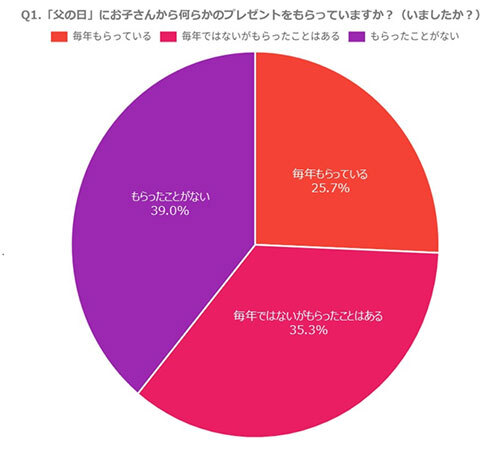 はじめに「父の日に子どもからプレゼントをもらったことがあるか」を聞いたところ、「毎年もらっている」が25.7%、「毎年ではないがもらったことはある」が35.3%で、「もらったことがない」が39.0%だった。