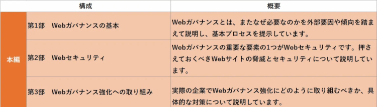 Webガバナンスガイドラインは、総ページ数55ページ、第1部~第3部で構成されている。第1部から利用することで、ウェブガバナンスの基礎から理解でき、第3部の具体的な対応に進めるような構成としている。また、ウェブガバナンスでとくに気をつける必要のあるウェブセキュリティーについては、第2部として重点的に取り上げている。さらに、実践しやすいチェックリストを別紙として用意している。