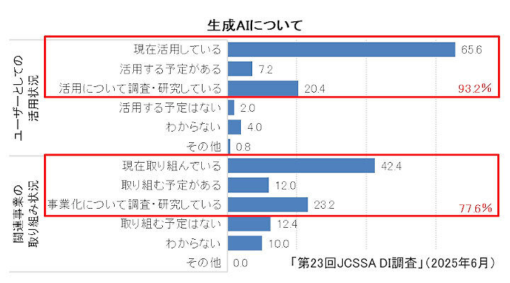 生成AIを「現在活用している」のは65.6%だった。一年前の調査結果と比較すると、28ポイント増加した。主な活用方法としては、「文書作成・校正・翻訳」や「営業活動」が上位を占めた。