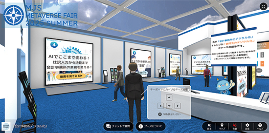 「MJS METAVERSE FAIR 2025 夏」と題して入場無料で開催し、財務・会計や給与、会計事務所デジタル化、人事労務などのテーマ別に10のブースを設けた。参加登録したユーザーは、ログインすると自身のアバターが出現し、実際の展示会場のように興味があるブースを回ることができる。ブース内には経営課題やソリューションごとに資料や動画の案内があり、クリックして閲覧する。24時間入場でき、ライブセミナーも毎日開催している。製品担当者がリアルタイムでチャット対応する「コミュニケーションアワー」もあり、対面開催のような双方向のコミュニケーションが可能だ。