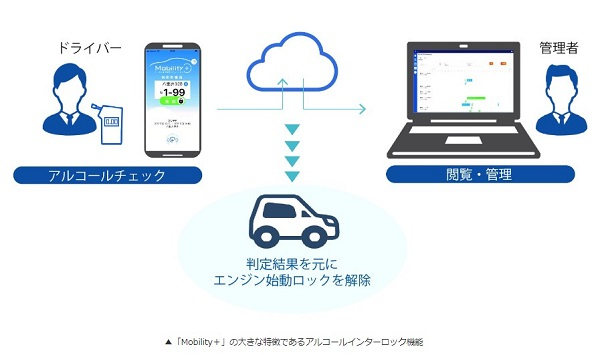 Mobility+は、オンライン車両予約や運転日報の自動作成、運転傾向の分析などの機能に加えて、鍵の受け渡しをなくすデジタルキーや、ドライバーのアルコールチェックにおいてアルコールを検知した場合、車のエンジン始動をロックするアルコールインターロック機能を搭載しているのが特徴だ。