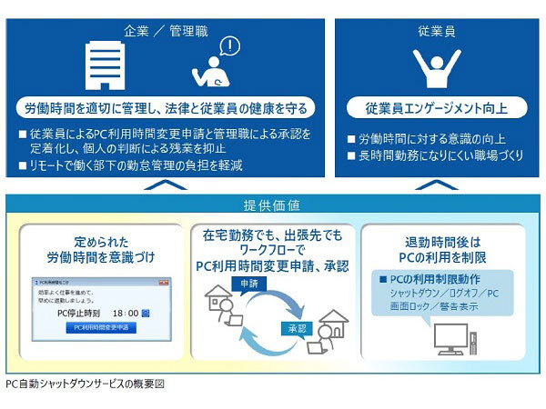 PC自動シャットダウンサービスは、指定された退勤時間や1日の累計利用時間に応じて従業員のPC利用を自動で制限する。利用時間を延長するには、事前に申請を行い管理職の承認を得る必要がある。管理職はワークフロー履歴の確認を行えるため、リモートで働く従業員の勤怠管理にかかる業務負担を軽減できる。