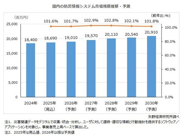 防災情報システムとは、災害関連データをデジタルで収集・統合・分析し、ユーザに対して適時・適切な情報と行動指針を提供するソフトウェアおよびアプリケーションと定義している。従来、防災関連投資の多くはインフラ復旧や食品、日用品の備蓄といったハード面の整備が中心だったが、近年は気候変動リスクの顕在化を受け、平常時からリスクを可視化し異常時に即時通知できる仕組みの整備が進んでおり、情報システムやソフトウェア分野への投資拡大につながっているという。25年の防災情報システム市場は前年比1.6%増の186億9000万円を見込んでおり、今後も微増で推移していく見通しとした。