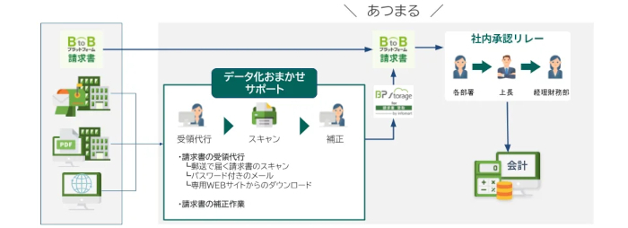 「データ化おまかせサポート」は、多様化する請求書データの受け取りをBtoBプラットフォーム請求書へ集約し、仕訳・承認といった社内業務の一元化を支援するサービス。