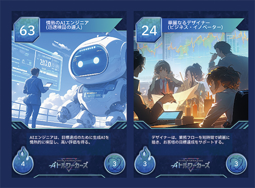 提供されるのは「Generative AI Card Game Training - バトルワーカーズ」。「IBM Cloud」上に構築されたゲームにログインした参加者が、自身の仕事についての情報を入力し、「IBM watsonx」などと連携してカードに必要なテキストやイラストを生成する。ダウンロードしたカードの0から99までの「バトルスコア」で相手と対戦し、高いほうがポイントを得るルールだ。