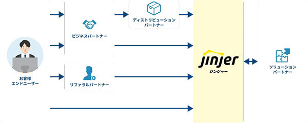 プログラムでは、販売実績や技術力など、パートナー企業の強みや事業モデルに合わせて四つの区分を設定。製品の購入意向があるエンドユーザーをjinjerに紹介する「リファラルパートナー」、エンドユーザーに豊富なソリューションを提供できる「ビジネスパートナー」、全国に販路を持つ「ディストリビューションパートナー」、技術的な連携を行う「ソリューションパートナー」に分かれる。