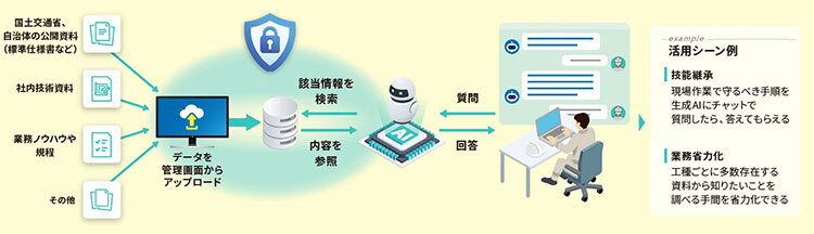建設現場ですぐに利用できるよう、作業手順や標準仕様書の検索機能、標準仕様書における新旧の差異比較機能を搭載。ユーザーに生成AIの専門的な知識がなくても、チャット形式で質問することで必要な情報を収集可能なのが特徴だ。
