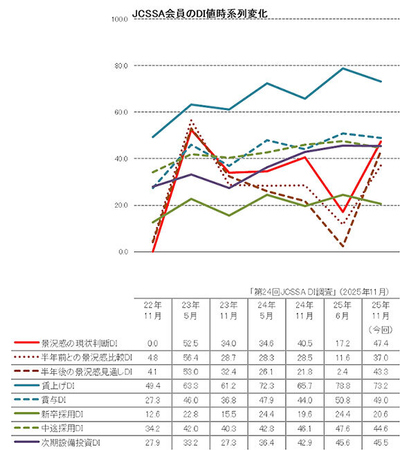 景況感以外のDI値はすべて前回よりも若干のポイント減となった。「賃上げDI」は前回比で-5.6ポイントの73.2だが、他のDI値より高い水準を維持している。「賞与DI」も49.0と、前回比は-1.8ポイントとなった。採用関連では、「新卒採用DI」の20.6(前回比:-3.8ポイント)、「中途採用DI」の44.6(同:-3.0ポイント)と、ともに前回比で3~4ポイント程落ち込んでいる。「次期設備投資DI」は、前回とほぼ同水準の45.5だった。