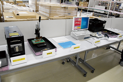 修理だけでなくライフサイクル管理(LCM)サービスの拠点でもある。端末の調達からキッティング、端末管理、廃棄をユーザーに代わって行う。最適化された独自ツールが作業を支える。ラベルの貼付には専用の治具を使い、誰でも同じ位置に貼れるように工夫。作業時はカメラで状態をチェックし、作業ミスを防止する。梱包した重量が出荷数と合致するか、バーコードで確認するシステムもある。ソフトウェアの消去時は完了画面を天井カメラで撮影し、ハードウェアはパンチャーなどで物理破壊する。