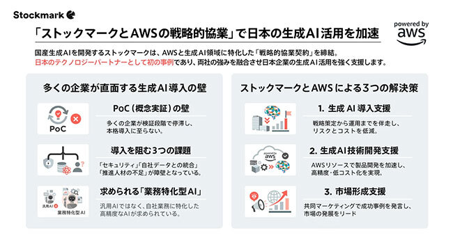 米Amazon Web Services(アマゾン・ウェブ・サービス、AWS)とストックマークは1月27日、生成AI領域に特化した戦略的協業契約を締結したと発表した。導入支援、技術開発、市場形成の各フェーズにおいて、AWSのグローバルリソースとストックマークの技術力を掛け合わせて顧客価値の最大化に取り組む。