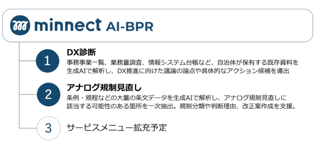 今後は、minnect AI-BPRのサービスメニューの拡充を図る。自治体DXにおける構想段階から、実行・定着までの移行を支援する。