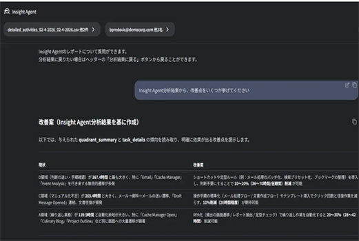 Insight Agentは、専門知識がなくとも、チャット形式で指示するだけでログを解析し、数値の根拠に基づく業務分析やレポート作成、課題の深掘りを行う。例えば、データの重複入力などの非効率な作業を検知した場合には、業務プロセスの自動化や入力フォームの統合といった具体的な改善策を提案する。