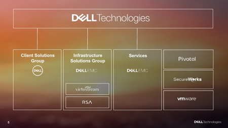PC事業がDell、インフラ事業とサービスがDell EMCのブランドに再編され、VMwareなどの固有企業は従来通り継続