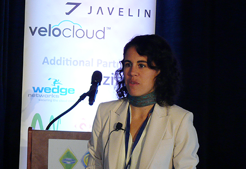 基調講演のテーマは「AI(人工知能)」で、AIが研究の枠から抜け出して、ネットワークやサイバーセキュリティでどのように活用されているかについて説明。まずは、米ファスト フォワード ラボのキャサリン・ヒューム社長が登場。同社は、リアルタイム計算とデータサイエンスの技術を生かした製品・サービスを提供している。SF映画では夢物語のように描かれているAIについて、ヒューム社長は「人間がこれまで考えていたスピードやレスポンスを覆すものであることは確かだが、(人間が)いかに上手に生かして変化に対応できるかが重要になる」と説いた。