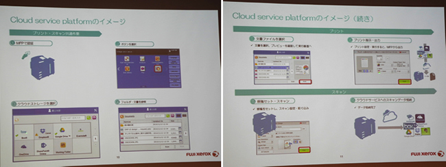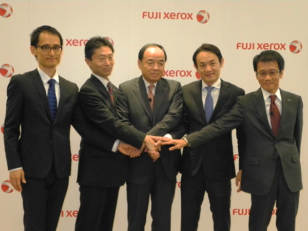 会見の冒頭で登壇した富士ゼロックスの栗原社長は、「当社はドキュメントの処理や複写という切り口から、コミュニケーションの活性化と意思決定の支援に関わってきた」と、自社の立ち位置を強調。そのうえで、ICTの進化やグローバル化、ワークライフバランスの実現などへの対応が求められる、これからのオフィスについて、「ポータルとして、より幅広く、多様な利用を目指したい、という声が以前からあった。こうしたニーズに対して、自社で提供しているものだけでカバーするのでなく、クラウドサービスを展開している各社と連携することで、『ポータルとしてのMFPの位置づけ』を追求したい。経費処理、名刺管理、コンテンツ管理といったそれぞれの分野で市場をリードしている3社との協業を皮切りに、時代に即した価値あるコミュニケーションをパートナー企業と連携しながら提供していきたい」と、今後の方向性を示した。