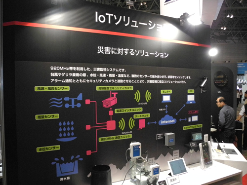 ホール2の「社会」エリアでは、日本アンテナが今回のCEATECのテーマに合わせてIoTソリューションを前面に押し出した。さまざまな環境をセンシングするデバイスで集めた情報と、従来から展開していたセキュリティカメラの情報を連動させた災害監視ソリューションが目を引いた。「ここ数年、自治体などをはじめとした既存顧客やそのパートナーから、有線だけでなく無線で何かできないか、との要望を受けることが多くなってきた」(情報機器技術部の志久間仁氏)と、IoTの盛り上がりを実感しているという。